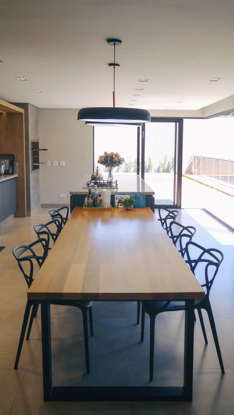Estruturas em concreto aparente e metal, pedras no piso, tijolos nas paredes, madeira e vegetações do paisagismo compõe a materialidade da casa.