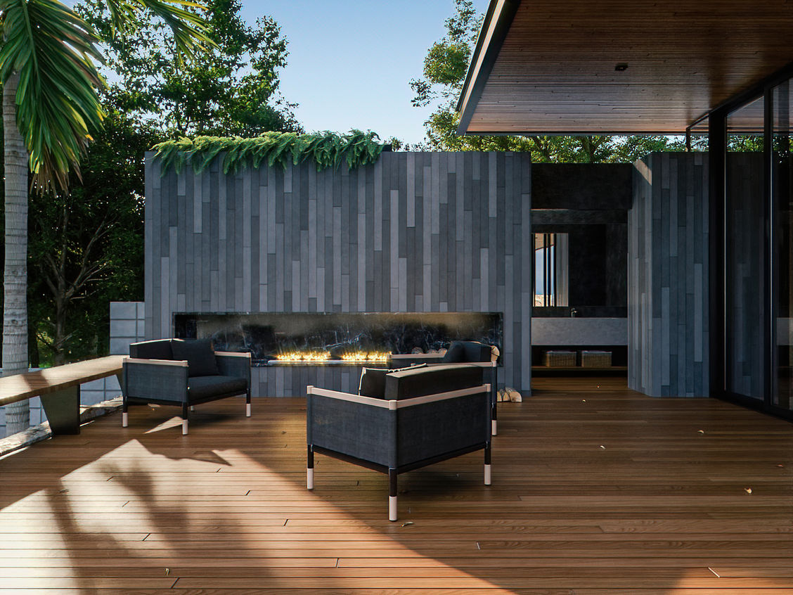 Decidimos então utilizar vários elementos em madeira com a finalidade de mimetizar a construção em seu entorno. Forro, deck, painéis e pergolado… diferentes funções, com o mesmo propósito.