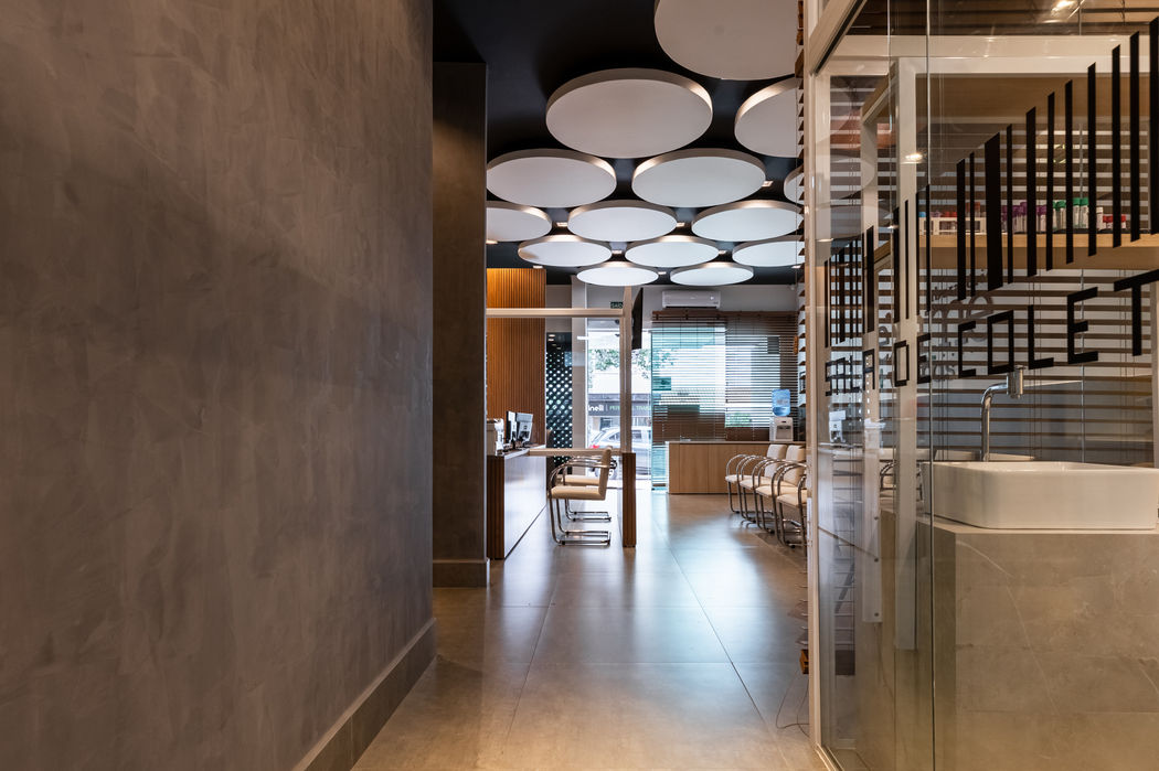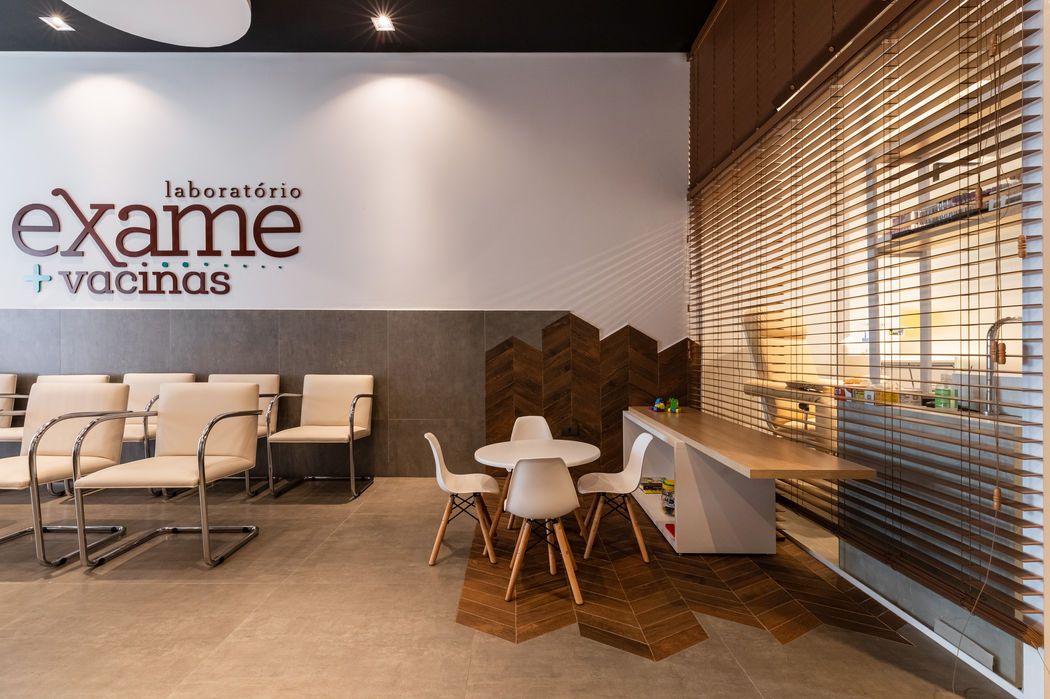 A proposta foi criar uma atmosfera acolhedora e confortável para as pessoas. O painel perfurado da fachada mantem a mesma identidade de outras unidades do Laboratório Exame espalhados pela cidade. Um detalhe legal desse painel, é a sombra projetada por suas aberturas circulares, facilitando a entrada de luz natural e assegurando a privacidade. Por conta do pé direito alto, decidimos pintar o forro de preto, e criar com as nuvens acústicas brancas uma sensação que estão flutuando pela recepção.